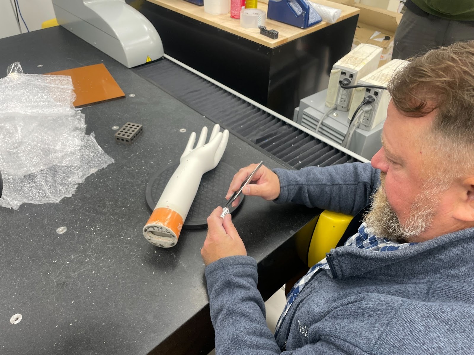 Blue-light structured-light scanning was used to determine the surface area of a ceramic glove former (or mold) used in the manufacturing process of medical gloves. The blue-light method incorporated a calibrated pattern of blue light projected onto the object. When the light washed over the surface of the glove former, it was distorted by the shape, curves, and edges. The distorted light was reflected to the scanner and was picked up by stereographic camera lenses. It took approximately 36 captures per part to build a complete 3D image. Nel PreTech used ATOS Professional scanning software to gather the data. The scans or frames were aligned and processed to form the seamless 3D model. The uncertainty of the 350 measurement volume was 30 microns (0.03mm).